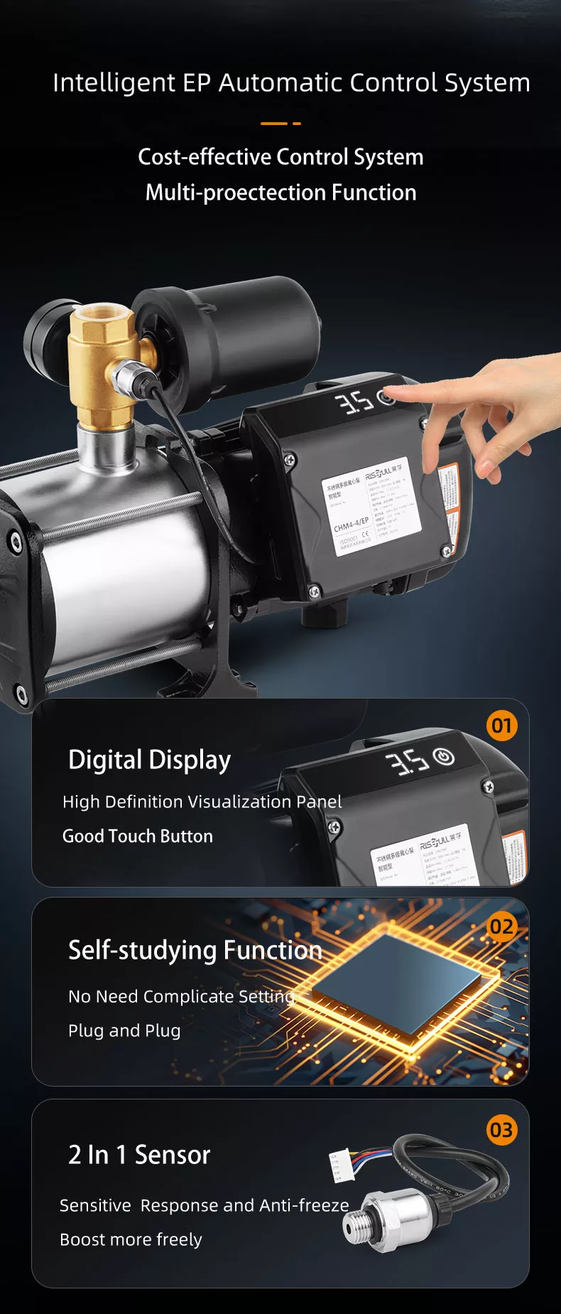1 .. Pompa centrifugal Mulstisage minangka struktur vertikal kanthi tilas cilik. Pusat gravitasi pompa bertepatan karo pusat sikil Pompa, saengga mlaku kanthi alon, duwe getaran sethithik, lan duwe umur dawa.