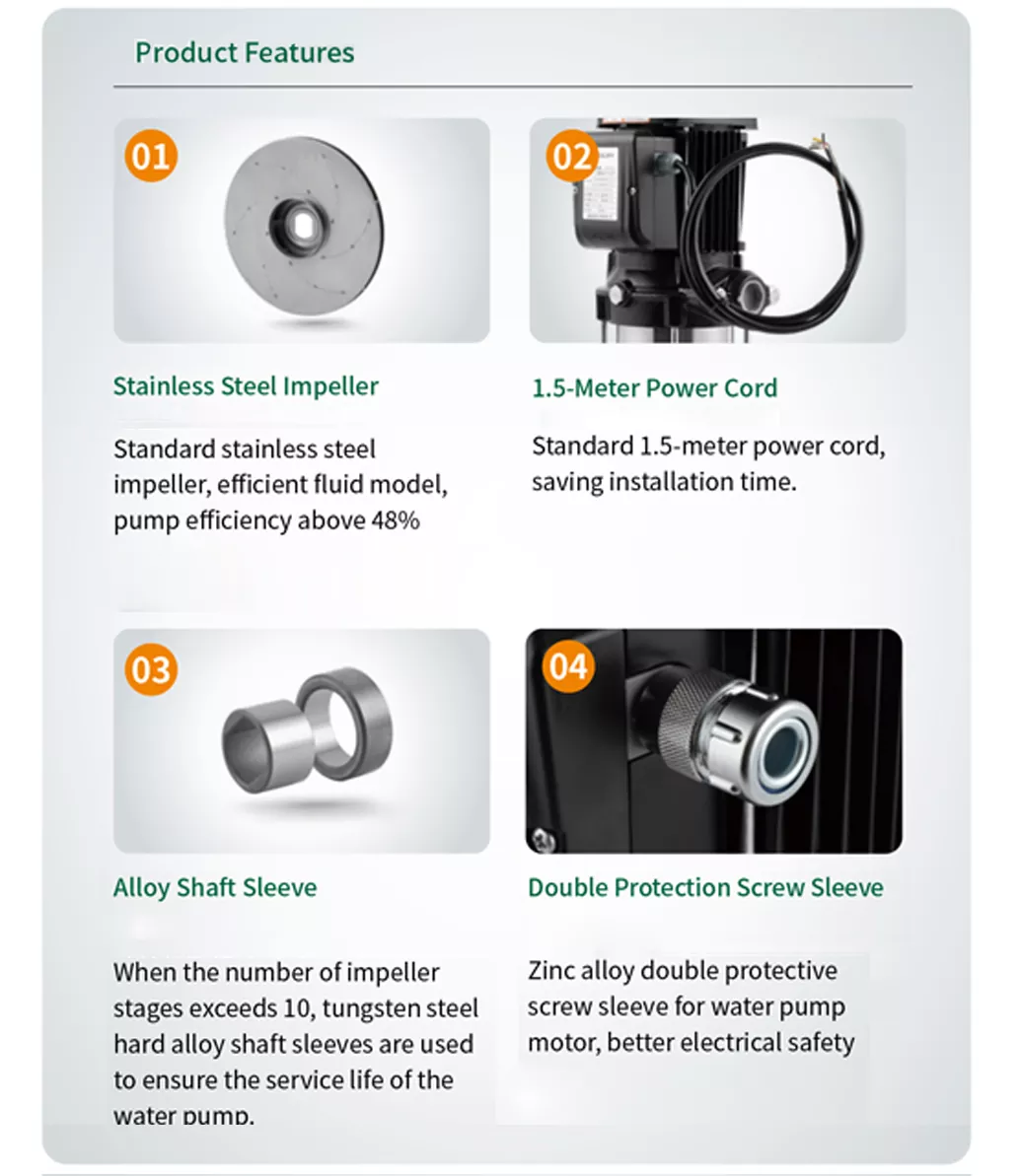 Kepala pompa bisa diatur kanthi ngganti jumlah impeller kanggo nyukupi macem-macem syarat. Cocog kanggo banyu utawa cairan sing resik kanthi sifat sing padha, dene model tartamtu bisa disesuaikan kanggo media corrosive.